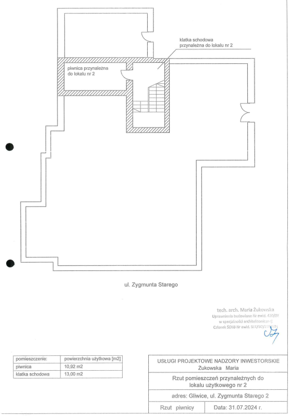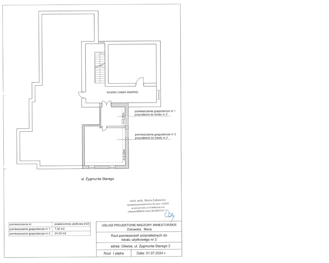 ● POWIERZCHNIA POMIESZCZENIA PRZYNALEŻNEGO: dwa pomieszczenia gospodarcze o powierzchni 7,32 m2 i 24,32 m2 zlokalizowane na I piętrze budynku oraz piwnica wraz z klatką schodową o powierzchni 23,92 m2